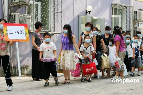 7月7日17时,北京南湖中园小学的多数密切接触师生解除为期7天的集中医学观察。本月1日,北京南湖中园小学首次确诊7名学生感染甲型H1N1流感,卫生部门将已查找到的93名学生、20名教师和41名家长共154名密切接触者,进行集中医学观察;同时,卫教部门与相关人员所在地的社区卫生服务机构联系,对校内的其他师生落实为期7天的居家医学观察措施。中新社发 富田 摄