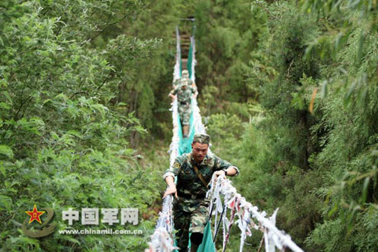 竞赛途中穿越山林吊桥。