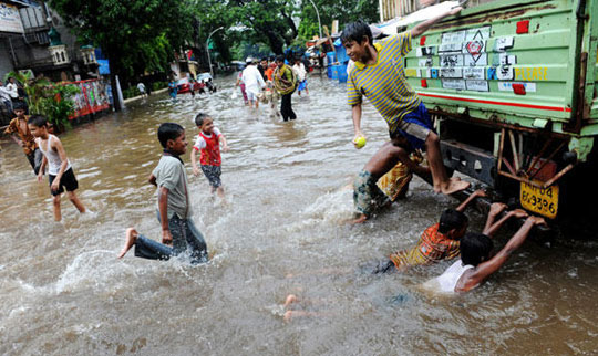 受季风气候影响,印度孟买数条街道被降雨所引发的洪水淹没。图为7月8日当地的孩子们在洪水中玩乐。