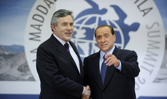 7月8日,在意大利拉奎拉,意大利总理贝卢斯科尼(右)欢迎英国首相布朗。为期3天的八国集团首脑会议当日在拉奎拉正式拉开帷幕。