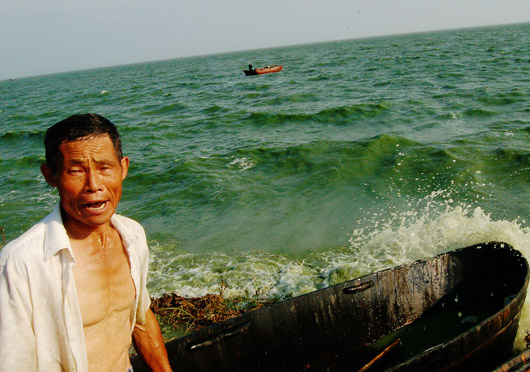 2009年7月8日,安徽省巢湖市巢湖东半湖大面积蓝藻。当日,安徽省巢湖市忠庙镇,大面积蓝藻积聚在该镇境内。由于受偏南风影响,记者引湖滨往东行走,一直到龟山附近,近20公里的路程,都有面积较大的蓝藻漂浮在湖面上,同时能闻到刺鼻的臭味。目前,巢湖市防控措施已经升级,应急预案已经启动。马丰成/CFP