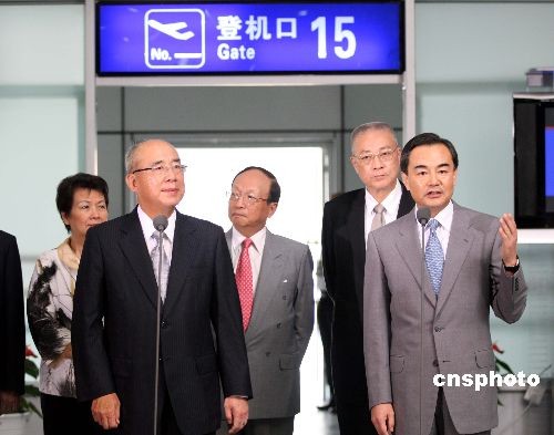 中国国民党主席吴伯雄率参加第五届两岸经贸文化论坛的中国国民党代表团,7月10日下午乘台北直飞的包机抵达湖南长沙黄花机场。中共中央台办主任王毅等到机场欢迎并致辞欢迎。第五届两岸经贸文化论坛将于7月11日至12日在长沙举行,论坛的主题是两岸文教交流。中国国民党、亲民党、新党、无党团结联盟、部分民进党人士,和众多台湾文化、教育、宗教届和经济界代表与会。中新社发 宋吉河 摄