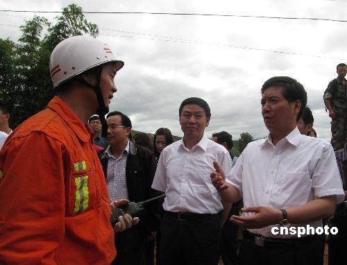 7月10日上午,云南省长秦光荣赶赴姚安地震灾区慰问民众,并看望了参与现场救援和险情排查的云南公安消防总队楚雄支队官兵。图为秦光荣叮嘱指挥官,要发扬精神确保抗震救灾工作取得全面胜利。中新社发 徐向良 摄