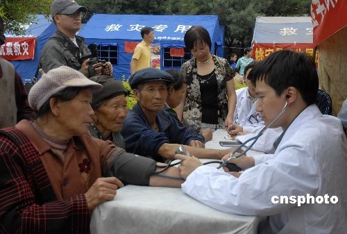 7月9日,云南姚安6级地震发生后,包括楚雄州卫生局、州医院、昆明医学院第二附属医院等医疗部门立即赶赴灾区参与救灾。图为7月10日上午,医护人员为灾区民众检查身体。中新社发 保旭 摄