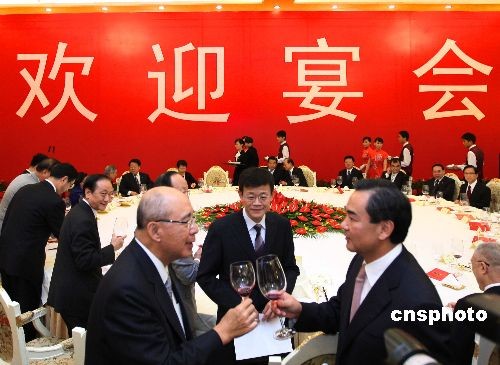 7月10日晚,中共中央台湾工作办公室主任王毅在第五届两岸经贸文化论坛欢迎晚宴上,与中国国民党主席吴伯雄相互敬酒,祝贺第五届两岸经贸文化论坛圆满成功。论坛将于7月11日至12日在长沙举行,论坛的主题是两岸文教交流。中国国民党、亲民党、新党、无党团结联盟、部分民进党人士,和众多台湾文化、教育、宗教界和经济界代表与会。中新社发 宋吉河 摄