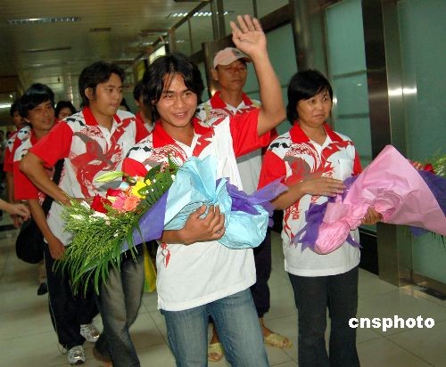 被印尼扣押的59名中国广西渔民于7月10日晚间平安回到祖国。 6月20日,8艘中国广西渔船以及75名渔民在中国南沙海域传统渔场内正常作业时,被印尼渔业执法船抓扣。经中方交涉,印尼最后决定继续扣留每艘渔船的船长和轮机长,其他的渔民则被释放,但是渔船被没收。中新社发 刘万强 摄