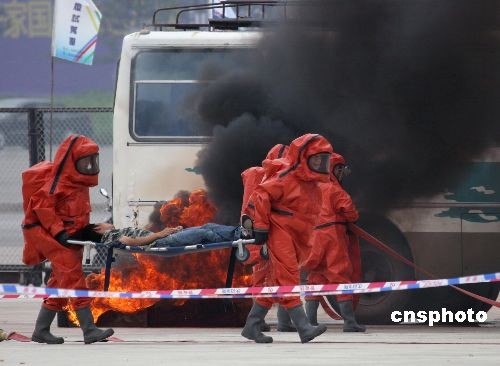 7月11日9时,沈阳市“0901”反恐演习暨国庆60周年安全保卫誓师大会在沈阳奥体中心广场举行。此次反恐演习以恐怖分子在公交车上投放有毒化学品为背景展开。中新社发 赵敬东 摄