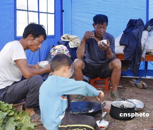 7月11日,云南地震灾区民众在灾民安置点吃饭。云南姚安地震灾区抗震救灾各项工作已全面展开,水、电、路和通讯等基础设施大部分恢复,灾民得到妥善安置,各受灾点的受灾民众基本生活得到保障。