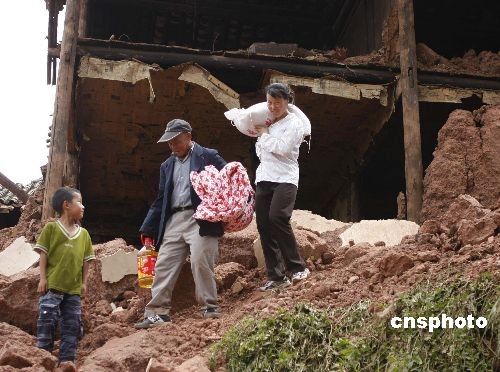 7月11日,领到救灾物资的村民。云南姚安地震灾区抗震救灾各项工作已全面展开,水、电、路和通讯等基础设施已大部分恢复,灾民得到妥善安置。截止到7月11日下午16点,已发放帐篷4326顶、棉被6580件、彩条布980捆。