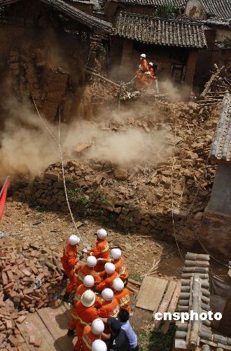 7月9日19时19分,云南省楚雄彝族自治州姚安县发生6.0级地震,造成1人死亡、300多人受伤,大批民房受损。地震发生后,当地武警、消防、公安全力以赴开展抗震救灾。图为7月11日,正在排除危房的消防官兵。