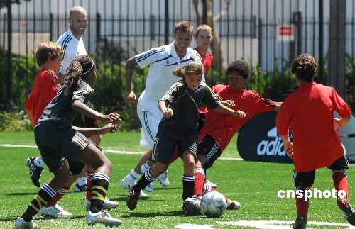 英国著名球星贝克汉姆与法国前国脚、著名球星齐达内,七月十一日在洛杉矶与少年球迷一起踢球。当天,由两位球星参与的在全美推广足球运动的“足迹赛场”计划正式启动。中新社发 张炜 摄
