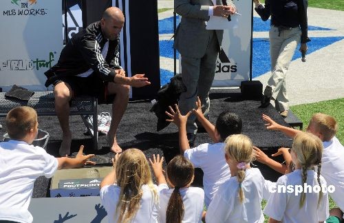 一群美国小球迷七月十一日争相向法国足球巨星齐达内索要其擦脚布。当天,齐达内与贝克汉姆一起启动一项推广美国足球运动的计划,并印下双脚脚模。两位球星用来擦脚的擦脚布竟也成为现场小球迷争抢的“香饽饽”。中新社发 张炜 摄