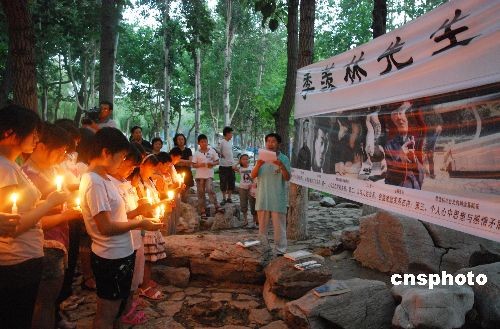 7月11日晚,山东聊城大学众多大学生在烛光中追思季羡林先生,为先生送行。国学大师季羡林于7月11日上午9时在北京301医院病逝,享年98岁。中新社发 张振祥 摄