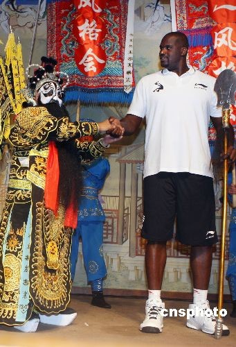 7月11日,与中国著名体育服装品牌签约的美国NBA超级球星“大鲨鱼”奥尼尔,在北京参加系列商业活动后欣赏中国传统京剧,并与剧中人物“西楚霸王”比试武艺。中新社发 任晨鸣 摄