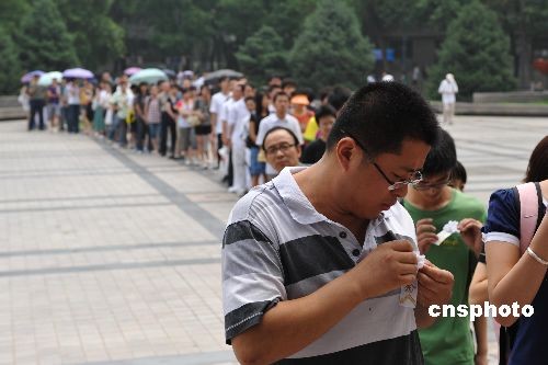 7月12日中午,北大百年纪念讲堂南大厅为季羡林先生所设灵堂开始对外开放,供学校师生和社会各界人士前来祭奠。7月11日上午,北京大学资深教授、国学大师季羡林先生在北京301医院辞世,享年98岁。图为大批民众排起了长队前往吊唁。中新社发 李学仕 摄