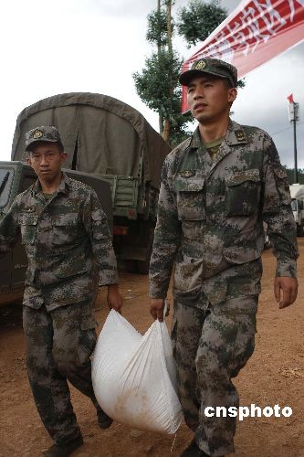 7月11日,救灾官兵向灾区群众捐赠大米等物资。云南省楚雄彝族自治州姚安县7月9日发生6.0级地震后,赶往地震灾区的救灾官兵不但在当地积极开展抗震救灾工作,还为当地群众捐款捐物献爱心。中新社发 刘冉阳 摄