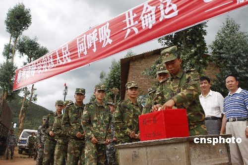 7月11日,云南省楚雄彝族自治州姚安县7月9日发生6.0级地震后,赶往地震灾区的救灾官兵不但在当地积极开展抗震救灾工作,还为当地群众捐款捐物献爱心。图为救灾官兵向灾区群众捐款。中新社发 刘冉阳 摄