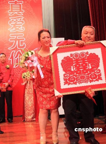 7月12日,中国红十字基金会新启动的和谐家庭公益基金与《家庭》期刊集团,共同为来自四川汶川地震灾区的15对震后重组家庭的新人主办一场特别的集体婚礼。北京市民代表、一群年过花甲的老人们以传统剪纸艺术创作的大红双喜字剪纸赠送给新人表达祝福。中新社发 孙自法 摄