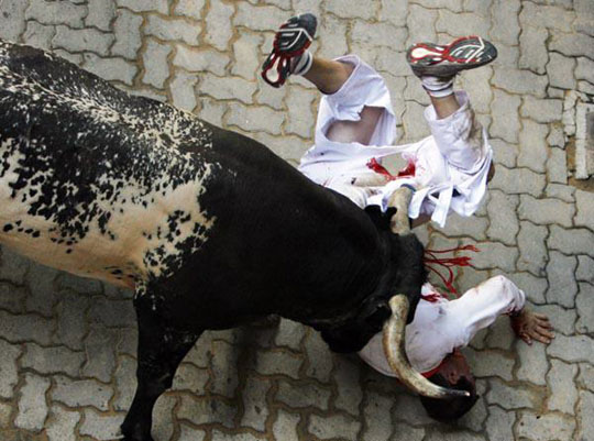 7月12日,在西班牙北部城市潘普洛纳,一年一度的奔牛节继续进行。尽管已经有人在奔牛街上死亡,然而爱好者仍然对于参加这一盛事乐此不疲。