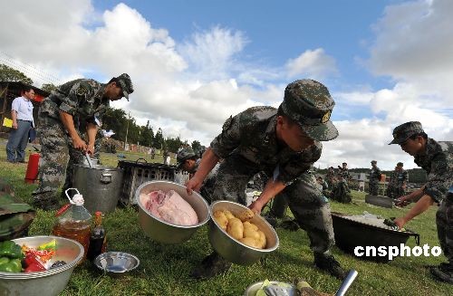 2009年7月13日,浙江舟山后勤保障官兵正在进行战地野炊比赛。当日,浙江省军区后勤专业大比武在驻舟山海防某部综合训练场进行,300多名后勤保障官兵参加了战地救护、战地野炊等12项专业技能的比赛。