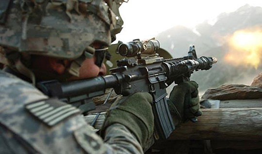 7月12日,在阿富汗东部努里斯坦省山区,美军士兵对塔利班武装人员控制的阵地进行打击。美军当天在该地区展开名为“山火”的军事行动。