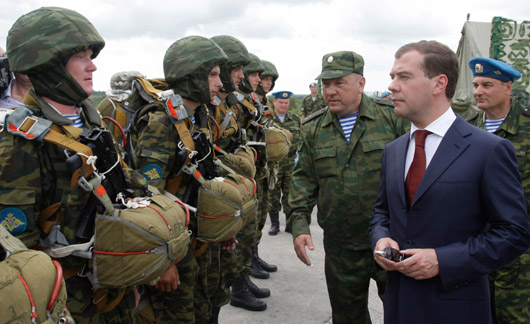 7月14日,俄罗斯总统梅德韦杰夫对俄南部联邦区进行工作视察,在拉耶夫斯基靶场参观了空降兵武器和军事技术装备,了解了空降兵战车、自行火炮和遥控装置。
