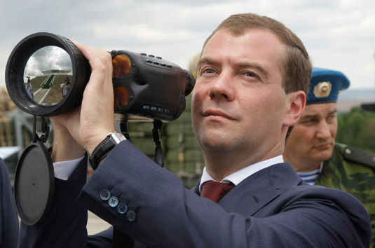 7月14日,俄罗斯总统梅德韦杰夫对俄南部联邦区进行工作视察,在拉耶夫斯基靶场参观了空降兵武器和军事技术装备,了解了空降兵战车、自行火炮和遥控装置。