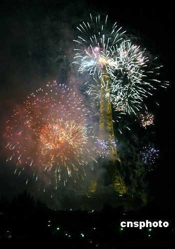 七月十四日晚,巴黎市在埃菲尔铁塔上燃放烟花,庆祝法国国庆。今年也是埃菲尔铁塔迎来一百二十岁生日,美仑美焕的烟火吸引了无数巴黎市民和游人观看。中新社发 吴卫中 摄