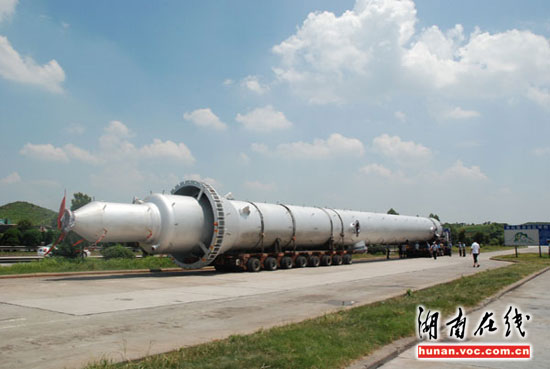 14日下午,一辆长大货车,驮着161.58吨重的巨型“导弹”途径京珠高速潭耒路段时,被耒阳高速交警查获。经测量,该车总长54米,其中所载“导弹”长47米,相当于三节火车车皮那么长(单节火车车皮长18米),属严重超限,且驾驶员无法提供有效的超限通行证件。