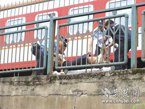 14日上午,一男子翻越京广线长江大桥武昌桥头护栏时,遇火车经过失足从护栏上坠下,头部遭火车撞击受重伤。