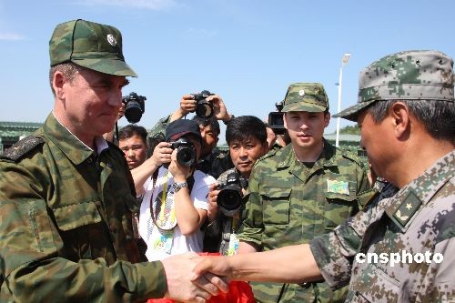 7月15日,参加“和平使命-2009”中俄联合反恐军事演习的中俄双方,在野营村举行开营仪式。图为双方指挥员握手。中新社发 张雷 摄