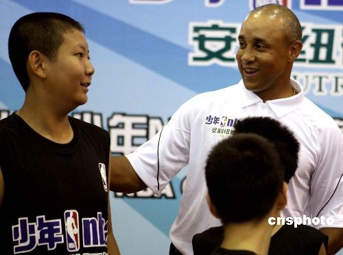 NBA传奇球星约翰·斯塔克斯亲临现场并与小球员交流。中新社发 宋吉河 摄
