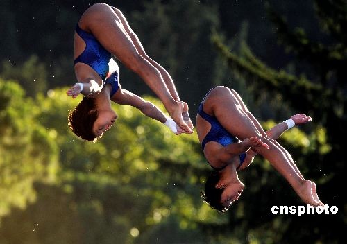 罗马时间7月19日傍晚,第13届游泳世锦赛跳水项目女子双人10米跳台的决赛中,中国选手陈若琳、王鑫以绝对优势获得这个项目的冠军,美国选手与马来西亚选手分获这个项目的亚军和季军。图为陈若琳、王鑫在决赛中。
