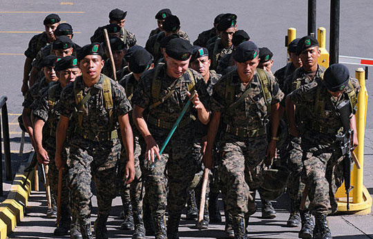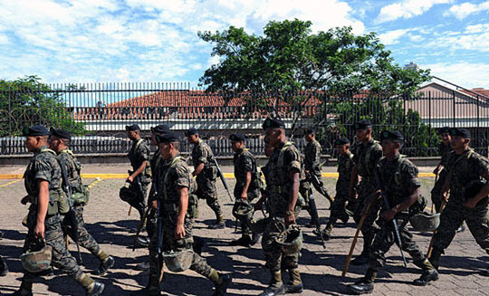 7月19日,在洪都拉斯首都特古西加尔巴,士兵在总统府的广场上执勤。洪都拉斯临时政府19日说,遭驱逐总统塞拉亚可以回国,但不是回国复职,而是接受叛国罪审判。