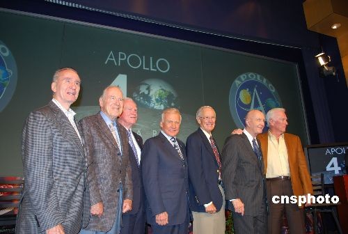 1969年7月20日,美国宇航员阿姆斯特朗和阿尔德林从“阿波罗11号”飞船登月舱走出来,首次在月球留下了人类的足迹,此后,包括他们在内,人类历史上先后共有12名宇航员成功登月。40年后的7月20日,当年阿波罗计划的其中7名宇航员聚首华盛顿美国航空航天局总部,出席记者会,纪念人类首次登月40周年。图为当日(从右至左分别为)曾执行阿波罗10号及阿波罗17号的宇航员尤金·赛尔南、曾执行阿波罗10号任务的托马斯·斯塔福德、阿波罗16号宇航员查理·杜克、与阿姆斯特朗一起首次登月的阿波罗11号宇航员巴兹·阿尔德林、阿波罗15号宇航员大卫·斯科特、阿波罗8号及阿波罗13号宇航员吉姆·洛威尔、阿波罗7号宇航员瓦尔特·康尼翰共同出席记者会。 中新社发 吴庆才 摄