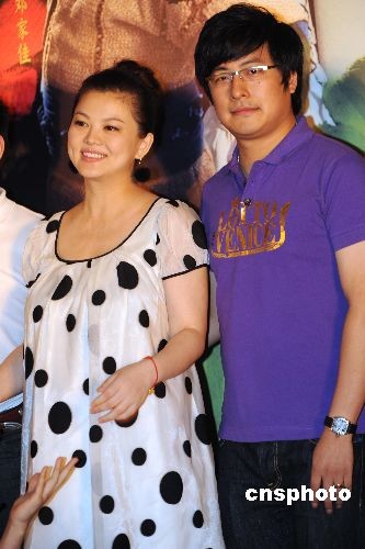 7月21日,古装爆笑喜剧《熊猫大侠》在北京举行了首版预告片暨海报发布记者会。李湘、王岳伦夫妇、主演邓家佳、阿朵、刘桦、后舍男生等出席。身为影片总制片人的李湘,挺大肚身着“熊猫”孕妇装,很好的掩饰了发福的身材,这也是她孕后首度在媒体面前公开亮相。已经怀孕6个月的李湘现场心情大好,不断展露甜美笑容。而身为该片导演的丈夫王岳伦更是小心翼翼搀扶,全程陪护。图为李湘在丈夫陪伴下登场。中新社发 李学仕 摄