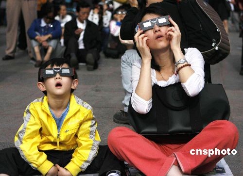 7月22日上午,众多昆明市民纷纷聚集到视野开阔的昆明市东风广场观看百年难遇的日食奇观。图为观看日食的母女俩。中新社发 刘冉阳 摄
