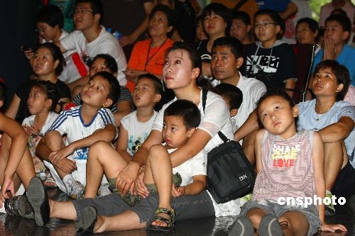 7月22日晨,北京遭遇阴天,与天文奇观日全食失之交臂。图为北京民众在天文馆的大屏幕前观看电视转播的日食奇观。中新社发 富田 摄