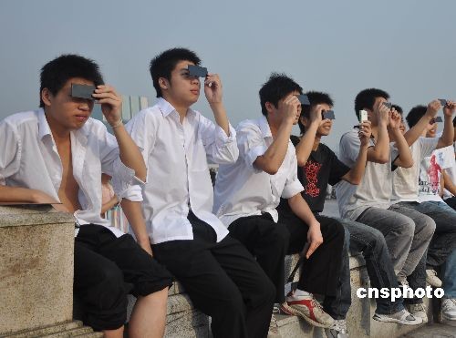 7月22日晨,几百年一遇的日全食奇景如约光临重庆,吸引众多当地市民和天文爱好者观看。图为一群当地少年人手一张X光片排排坐观看日全食。中新社发 郭晋嘉 摄