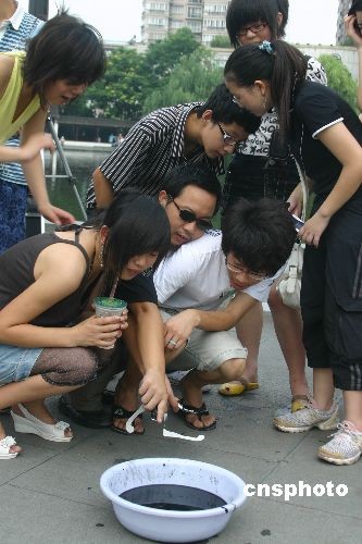 7月22日上午,本世纪最壮观的日全食沿长江流域自西向东滑过中国大地,上亿人民目睹了这500年一遇的奇观。图为在国际小商品城义乌市民广场上,有民众用清水加上墨水观赏日全食奇观。中新社发 董齐 摄