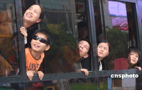 7月22日上午,处于日偏食地带的南宁市天气晴朗多。图为南宁市民在公交车上观看日偏食。中新社发 钱兴强 摄