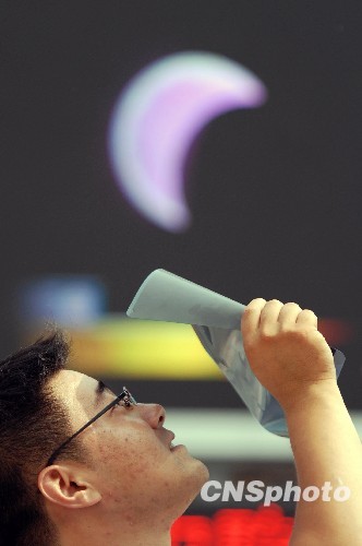 7月22日上午,辽宁省锦州市市民纷纷涌上街头观看日偏食。中新社发 谷进 摄