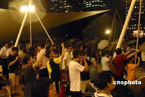7月22日上午,罕见日全食在一片雨蒙蒙中没入上海云层中,但许多“追日者”仍执著“观日”盼奇观。中新社发 潘索菲 摄