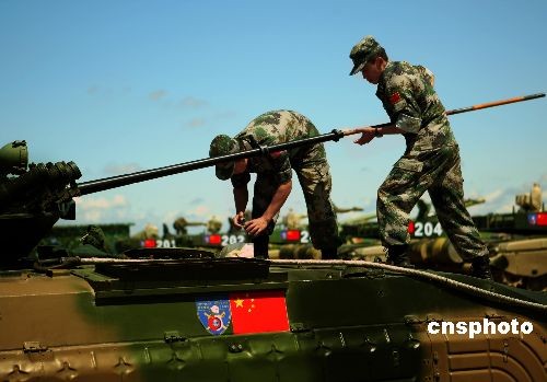 随着“和平使命2009”联合军事演习高峰的逼近,解放军陆军部队7月22日在清洗、擦拭、检修战车,以确保演习中万无一失。