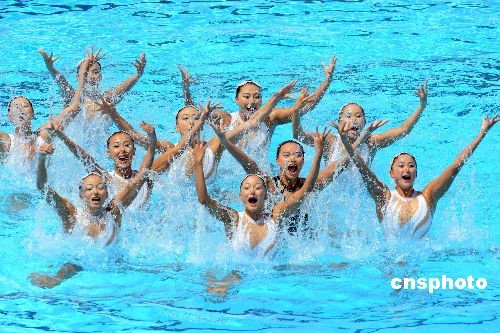 罗马时间7月22日上午,中国花游选手在罗马游泳世锦赛花样游泳集体项目自由自选组合决赛中。当日,中国花样游泳队在第13届游泳世锦赛再创辉煌,获得集体项目自由自选组合的银牌。这也是中国选手首次在国际大赛中夺取的花样游泳最好成绩。西班牙队获得金牌,加拿大队力压东道主意大利队夺取铜牌。中新社发 廖攀 摄