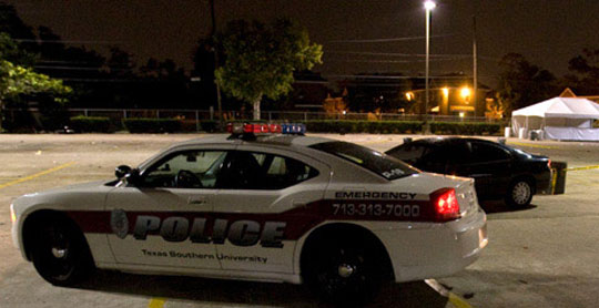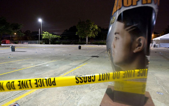 休斯敦市说唱歌手22日在得克萨斯南方大学校园为当地政界人士竞选造势时,一辆汽车行驶过来途中向人群开枪,打伤6人。图为警方封锁了发生枪击案的地点。