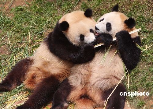 7月23日,两只“乐不思蜀”的灾区熊猫在昆明野生动物园打闹。三只来云南野生动物寄养的灾区熊猫思嘉、美茜、芊芊在园方的精心照料下健康成长,体重都增加了不少。芊芊由刚来的60公斤增加到现在的83公斤,美茜从刚来时的73公斤,长到了现在的92公斤,最胖的思嘉则从73公斤长到了95公斤。中新社发 刘冉阳 摄