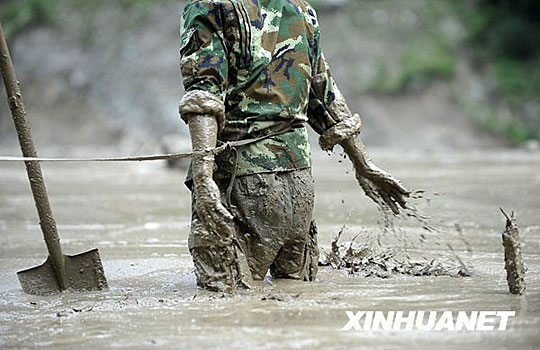 四川省康定县舍联乡干沟村响水沟处,一个战士在泥石流现场搜救。江宏景 摄