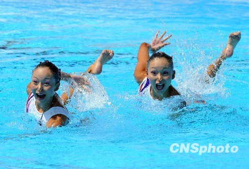 罗马时间7月24日上午,罗马游泳世锦赛举行花游双人自由自选项目决赛,中国花游双胞胎选手蒋文文、蒋婷婷以水中孔雀舞夺得铜牌,这是她们在罗马获得的第二枚花游双人项目铜牌。图为蒋文文、蒋婷婷在该项目决赛中。中新社发 廖攀 摄