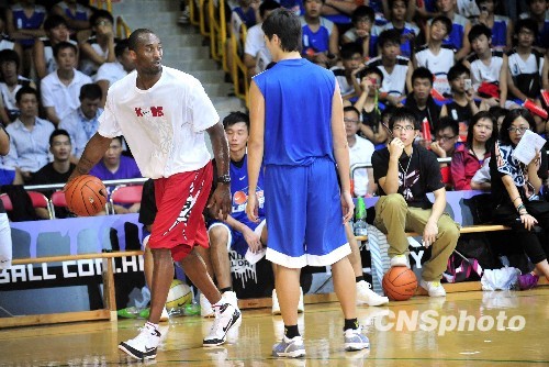上届带领洛杉矶湖人夺得NBA总冠军的科比七月二十四日下午访问香港并与热情的香港球迷会面。图为科比亲自指导香港年轻球员篮球技巧。中新社发 谭达明 摄